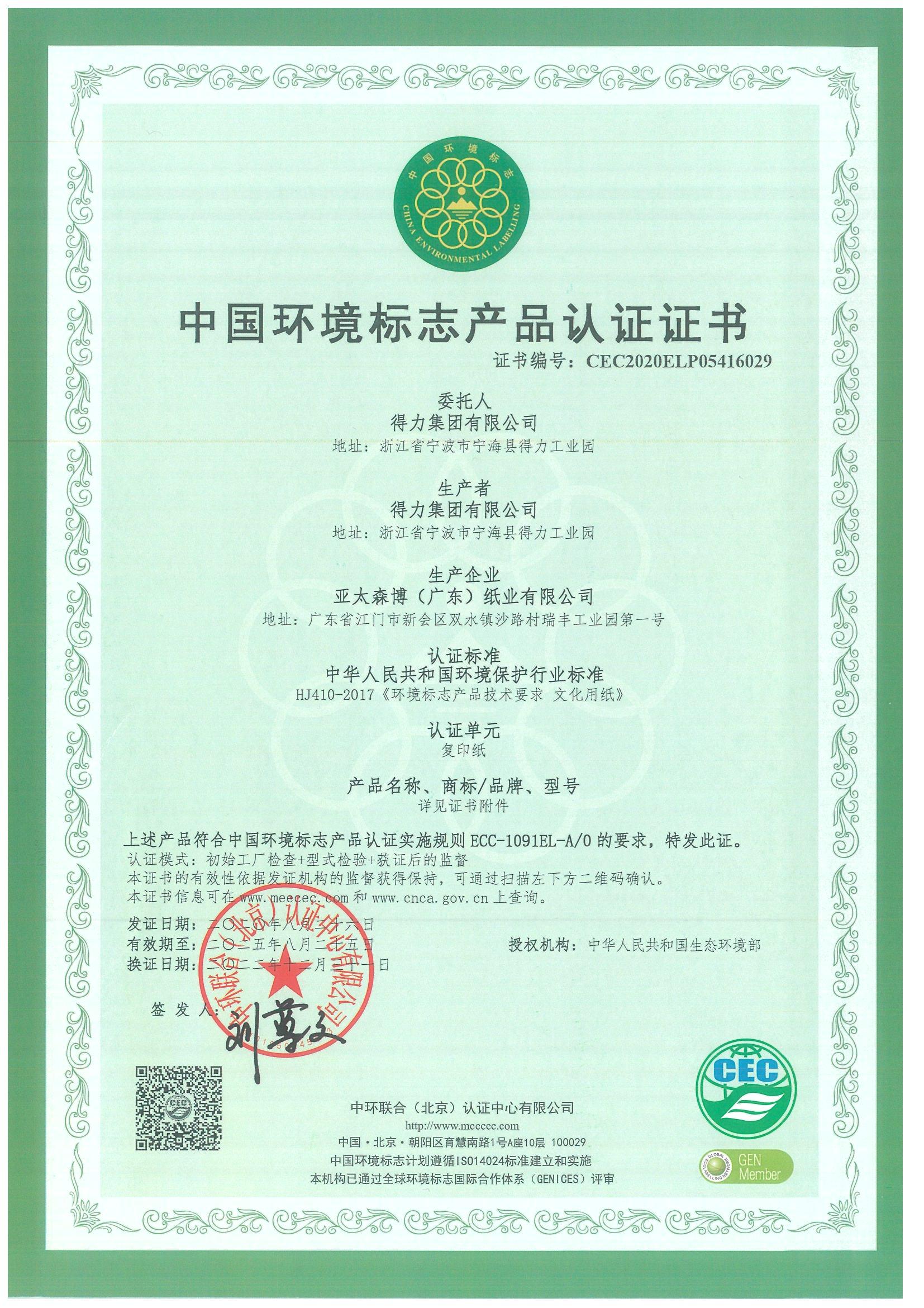 中國(guó)環(huán)境標(biāo)志產(chǎn)品認(rèn)證證書編號(hào)  :   CEC2020ELP05416029